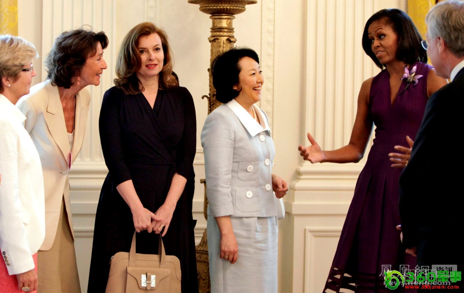 当地时间5月19日,华盛顿,参加G8峰会的领导人夫人参观白宫。照片中瓦莱丽身穿黑色的裙子。
