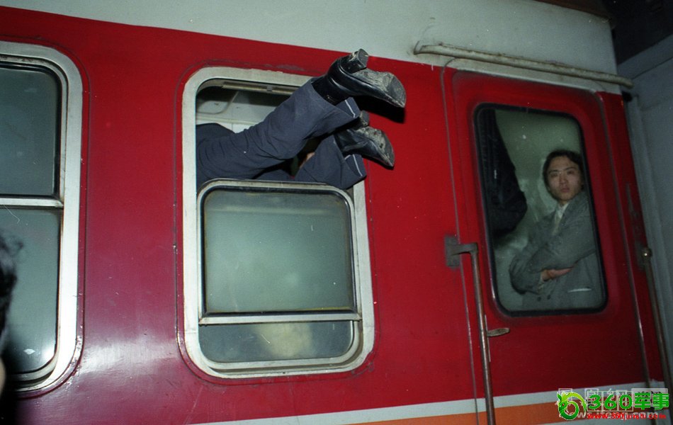 2000年春运,广州火车站站台,一名女乘客爬窗登车。