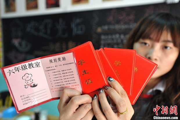 2月21日,重庆一家“80后的课堂”创意火锅店,工作人员正在展示“学生证”。