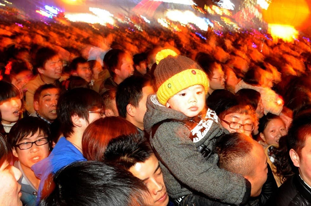 2013年2月24日,河南省郑州市,一个孩子骑在大人肩膀上,随人群进园。