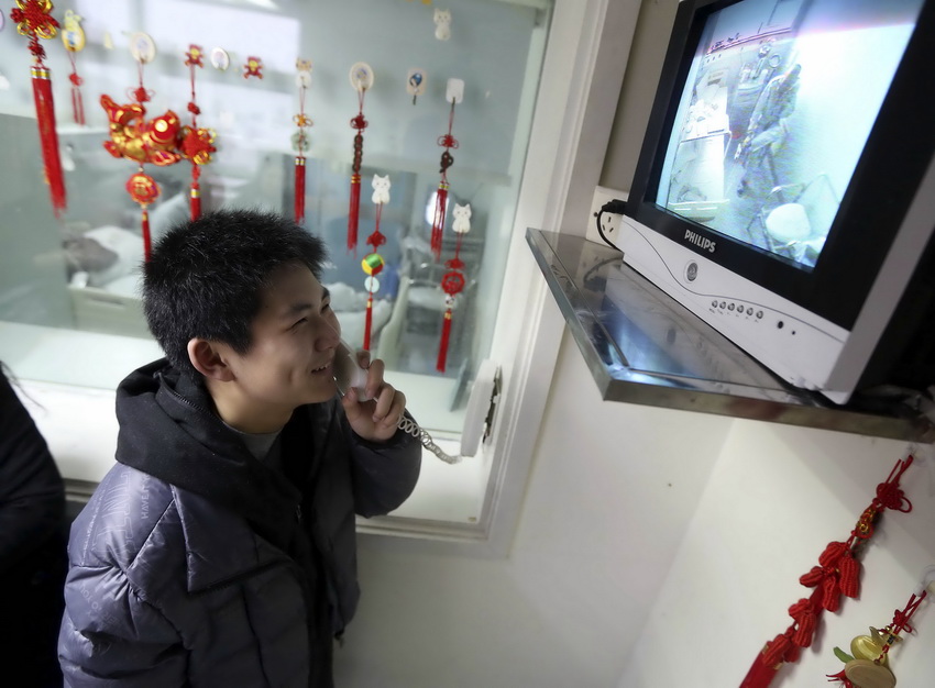 王一竹在苏州大学附属第一医院探视区与父亲视频通话(2月26日摄)