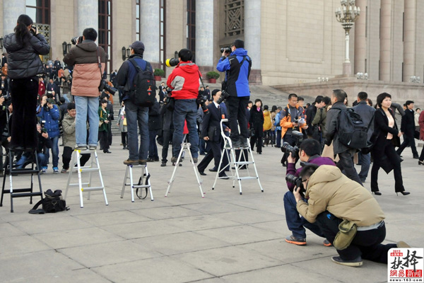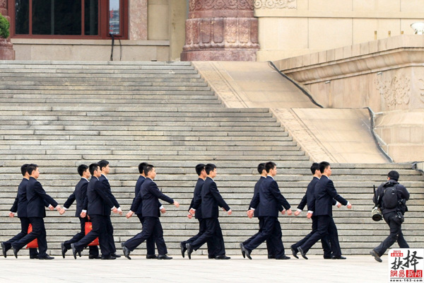3月2日,北京,参加两会报道的媒体记者跑步绕过安保人员拍照。