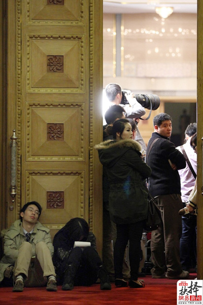 3月2日,北京,报道两会的记者倚在门边小憩。