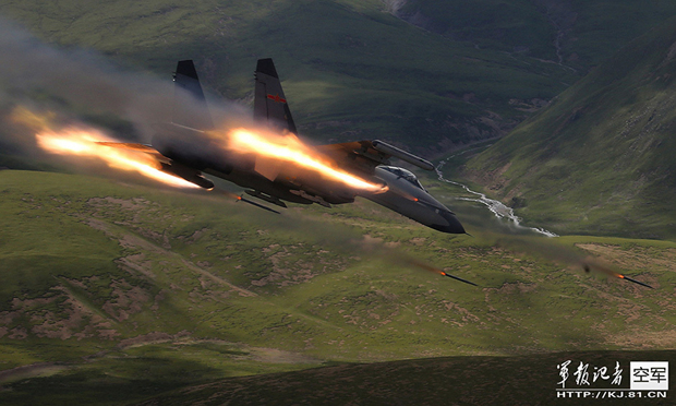 中国空军网:“隐蔽出航、发现目标、大角度跃升、倒飞俯冲、瞄准射击!”2012年8月10日上午10时,成空某航空兵团的8架歼-11战机编队准时临空高原靶场,迅速展开连续突击队形。图为歼11俯冲向对地面目标实施精确打击。