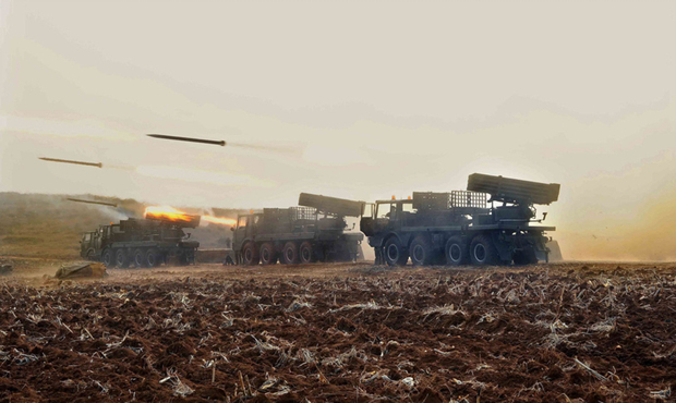 当地时间2013年2月26日消息,朝鲜最高领导人金正恩亲临炮兵部队现场指挥,以检阅部队的作战能力。图为朝中社提供的炮击场景,但并未透露具体日期。