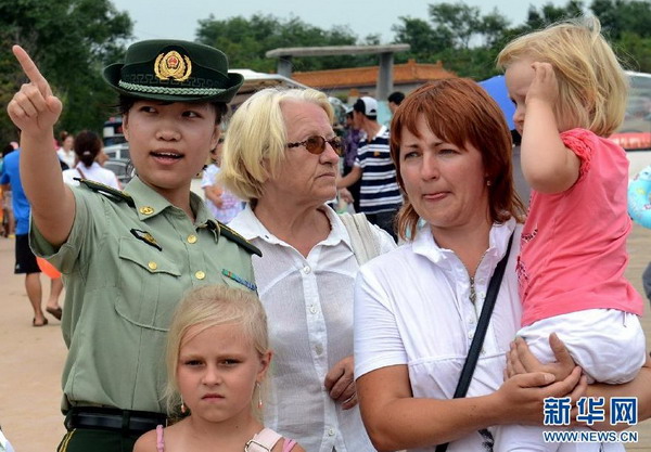 8月5日,秦皇岛市西河南边防派出所女子巡逻队民警刘文静在帮助前来咨询的外国游客。